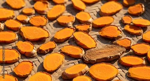 turmeric, drying, spice, sliced, healing, wellness, skin, vibrant, textured, medicine, therapeutic, holistic, method, remedy, alternative, earthy, produce, round, make well, health, life, root, indian, energy, processing, ayurveda, wholesome, medicative, fragrant, mat, herbal, woven, circular, favor, light, seasoning, powder, dehydration, daylight, sun, condiment, bamboo, orange, immunity, market, healthy, harvest, hot