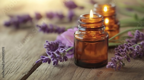 Aromatic Lavender Essential Oil Bottles Creating a Relaxing Spa Atmosphere on Wooden Surface : Generative AI