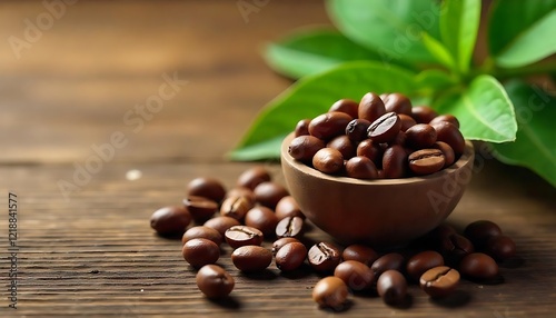 Aromatic roasted coffee beans in a wooden bowl on a rustic wooden surface with green leaves
