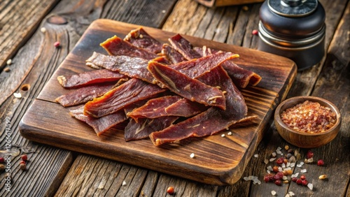 jerky, seasoned, spice, sea salt, rustic, wooden board, snack, food photography, delicious, tasty, epicure, protein, healthy, flavorful, culinary, gastronomy