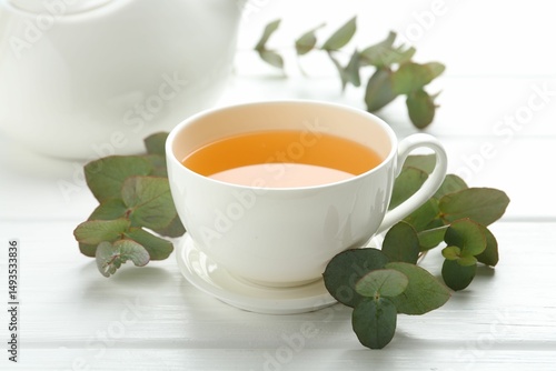 Aromatic tea in cup and eucalyptus branches on white wooden table, closeup
