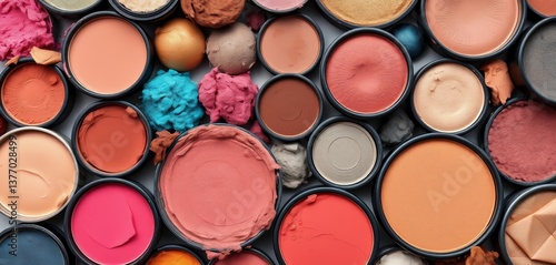 Array of colorful eyeshadows, blushes, and highlighters in various textures, blush, highlighter