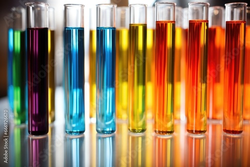 array of different colored test tubes in a lab