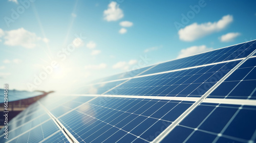 Array Of Solar Panels With Blue Sky And Sunlight Reflection Clean Energy Concept. Generative AI