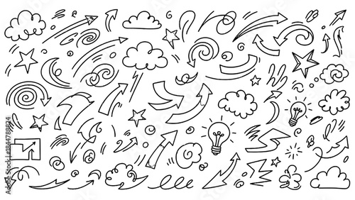 Arrows and Creativity: A whimsical array of hand-drawn arrows, clouds, stars and lightbulbs, symbolizing direction, innovation, and inspiration.