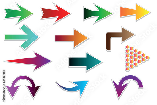 Arrows. Set of isolated multicolored arrows. Gradient arrows of different shapes on a white background. Blue, pink, purple, orange, green, yellow gradient colors. Vector design element.