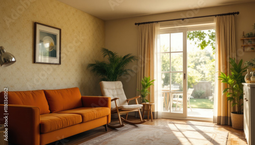 Art deco interor living room with a large window, curtains, a sofa, a coffee table, and a record player.