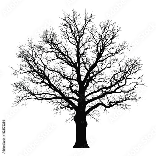 Art of striking silhouette of a bare deciduous tree, isolated on white background, showcasing intricate branches against a clean backdrop