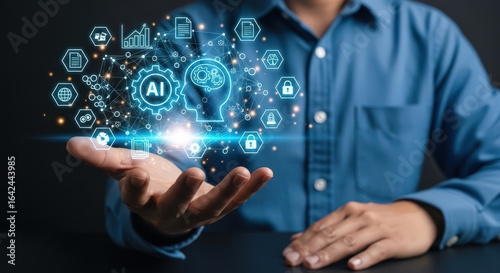 Artificial Intelligence and Technological Advancement A Person Holds a Holographic Display of AI Icons, Representing the Future of Technology and Digital Transformation