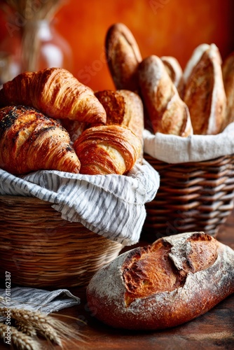 Artisan breads, baguettes, croissants in baskets, rustic loaves on cloth, bakery charm in warm detail.