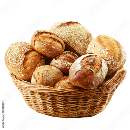 Artisan Breads in Wicker Basket Fresh Baked Goods Golden Crusts, isolated on a white background