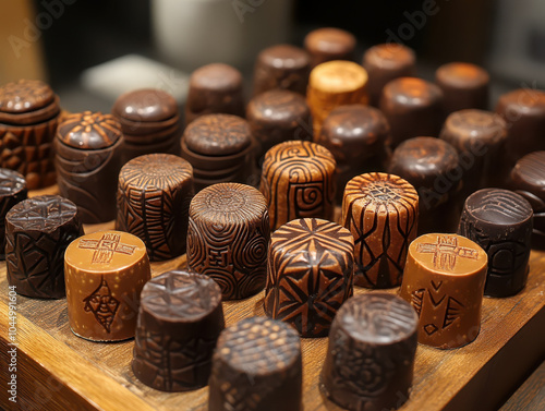 artisan, chocolate, display, intricate, design, epicure, luxury, pattern, wooden, surface, texture, craftsmanship, handcraft, sweet, dessert, indulgence, cocoa, presentation, culinary, elegance, specialty, artisanal, variety, food, boutique, lavish, rich, brown, artistic, styling, fancy, high-end, detail, confection, sweet, treat, selection