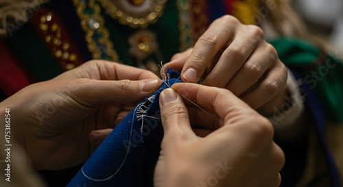 hand, sewing, needle, thread, fabric, blue, textile, craft, traditional, garment, embroidery, detail, closeup, working, skill, artisan, handcraft, hand-made, manual, process, creation, culture, heritage, art, design, fashion, making, folk, costume, clothing, meticulous, precise, sharpened, concentration, delicate, intricate, authentic, craftsmanship, hobby, bricolage, stitching