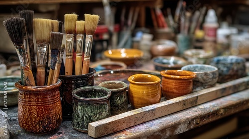Artisan pottery and paintbrushes on a cluttered artist's worktable in a ceramics studio with colorful glazed bowls and brushes for painting