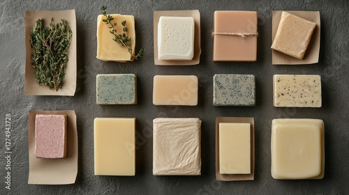 Artisan soap varieties displayed on slate surface kitchen setting product photography natural ingredients top-down view