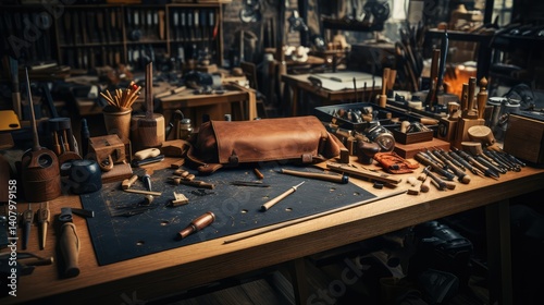 artisan, wooden, table, top, illustration, carpenter's shop, craftsmanship, walnut, tool, hammer, brush, leather, fabric, workshop, creativity, hand-made, texture, ambient, lighting, scene, material, sturdy, dark, rich, deep, surface, scattered, piece, warm, illuminated, background