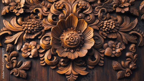 Artisan wooden wall featuring intricate carvings and a weathered rustic finish, showcasing craftsmanship and natural beauty.