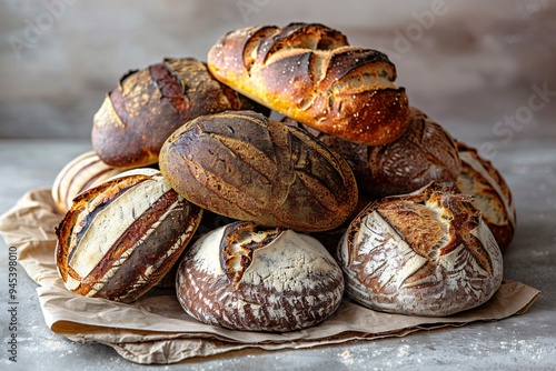 Artisanal bread with flour dust, backlit by warm sunlight in a rustic bakery.. Freshly baked bread in bakery shop, closeup.