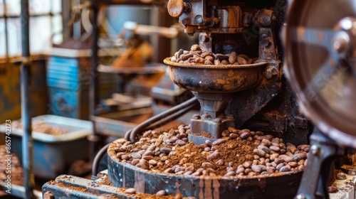 Artisanal Chocolate Making: Close-up of Vintage Chocolate Grinder Processing Cocoa Beans