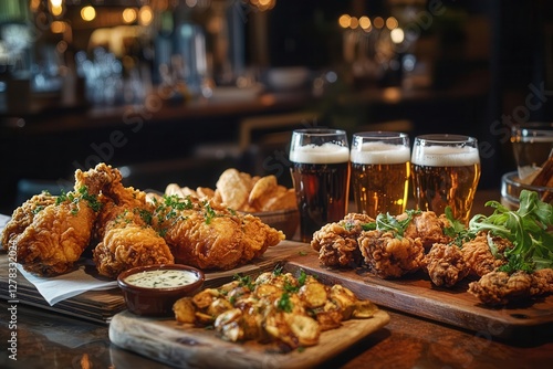 artisanal food spread featuring golden-crusted fried chicken, craft beer flights, and rustic wooden serving boards in warm ambient lighting
