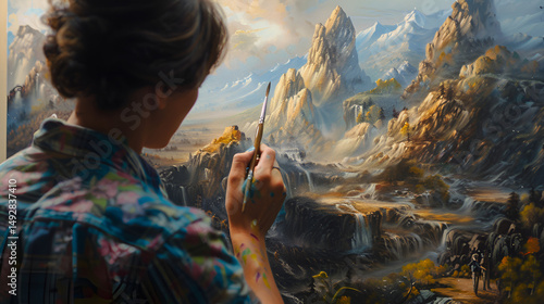 artist, painting, landscape, mountain, waterfall, brush, canvas, studio, artwork, creative, art, painter, scenery, nature, rock, tree, sky, cloud, river, stream, outdoors, vista, view, hand, arm, person, woman, hair, style, clothing, floral, pattern, indoor, skill, hobby, craft