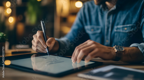 Artist using a digital tablet and stylus to draw a portrait