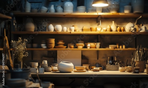 Artistic ceramic workshop with handcrafted pottery displayed on wooden shelves, tools, and soft light illuminating the creative spac