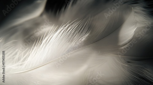 Artistic close-up of white feathers against a dark surface, capturing their delicate barbs and soft texture