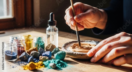 art, colours, creative, craft, hobby, paint, pigment, artistic, hand, brush, mixing, table, container, rock, glasses, dropper, water, texture, design, creation, inspiration, gold, blue, green, red, yellow, orange, supply, studio, workspace, light
