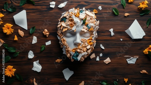 Artistic face mask with torn paper floral design surrounded by scattered petals and leaves on wooden surface
