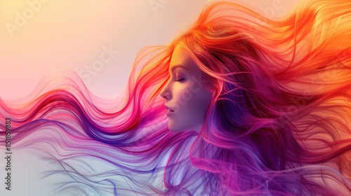 Artistic portrait of a woman with vibrant flowing hair in reds, oranges, and purples, blending into a dreamy gradient background.