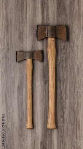 Artistic representation of two axes resting on a wooden table displaying intricate details and textures in a studio setting