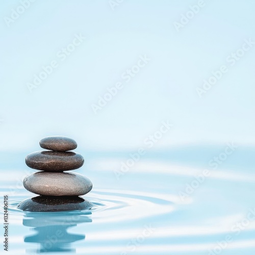 Artistic stack of smooth rocks balanced on water surface creating a tranquil natural scene