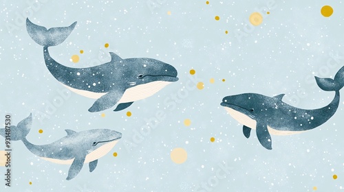 Artistic whales with flowing tails on a pale blue background with abstract dots
