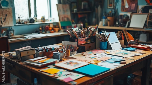 table, artist, messy, supply, brush, paint, paper, sketchbook, colours, art, studio, creative, workspace, chaotic, organised, clutter, desk, wooden, drawing, palette, notebook, tool, material, inspiration, design, craft, vibrant, colourful, texture, pattern, object, room, window, light, shadow, background, artwork, project, illustration, sketch