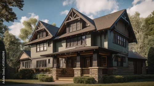 Arts and crafts exterior house design in daytime golden hour generative ai
