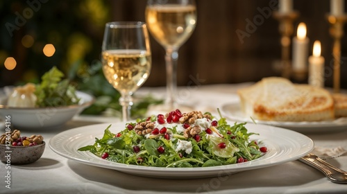 Arugula Salad with Pomegranate Seeds, Fresh Greens, Cheese, Elegant,Nutritious Dish, Romantic Dinner Setting, Fine Dining Experience, Healthy,Flavorful Meal, Gourmet Presentation, Balance of Texture a