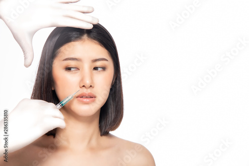 Asain young woman gets injection of botox in her lips. Woman in beauty salon. plastic surgery clinic.Beautiful woman gets botox injection in her face.