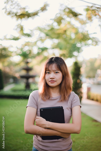 woman, young, tablet, student, park, beautiful, computer, people, happy, book, reading, person, outdoors, business, smiling, grass, outside, nature, portrait, beauty, technology, smile, university, laptop, working, media, chess, lifestyle, asia
