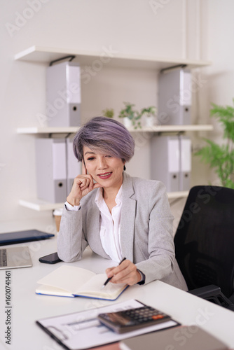 Asian Adult Businesswoman Strategic Planning Work Professional Executive Office Desk Writing Notes Career Management Entrepreneurial Success