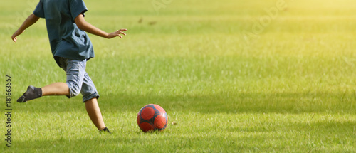 Asian boys, lift foot prepare to kick the soccer ball as strengt