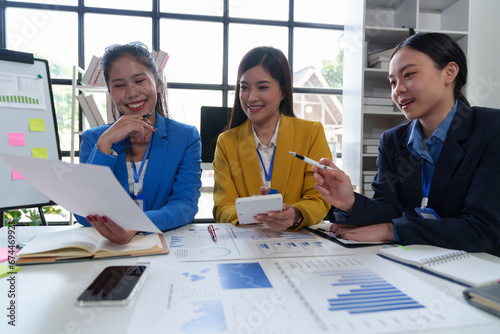 Asian business colleagues present and discuss investment project work and planning strategies. Budget calculation Income from documents reporting the company's business growth.