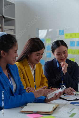 Asian business colleagues present and discuss investment project work and planning strategies. Budget calculation Income from documents reporting the company's business growth.