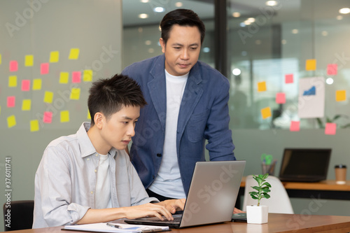 Asian business maen meeting and talk about job on labtop in office.