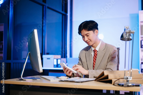 Asian Businessman analyzing reports in a modern office, working on a computer. Perfect for corporate, business, and over time concepts