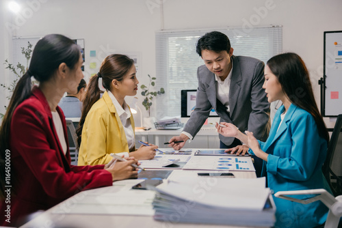 Asian businesspeople are discussing and brainstorming on tables and analyzing charts, graphs, and reports to plan new company strategies and develop marketing for business growth and success