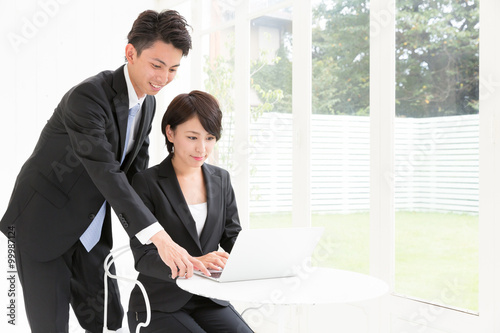 coffee, terrace, man, businessman, salaried employee, woman, ol, career woman, working girl, meeting, meeting, instruction, pointing, personal computer, notebook, two people, plural, people, smile, work, work, beauty, young, white, suit, japanese, asian, chinese