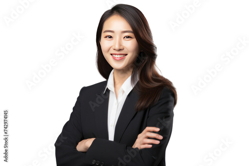 Asian businesswoman happy in suit, crossed arms isolated on transparent background.