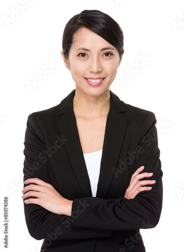 woman, lady, girl, female, japanese, korean, chinese, asia, asian, china, mandarin, taiwanese, cross, hand, folded, arm, fresh, charming, happiness, beautiful, pretty, dependability, satisfied, proud, isolated, white, background, people, person, portrait, 1, young, youth, black, smile, happy, business, businesswoman, commercial, teacher, leader, suit, corporate, executive, officer, adviser, profession, secretary, ponytail, hair