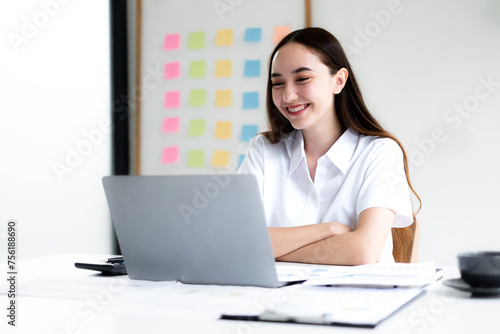 Asian businesswoman sit at their desks and calculate financial graphs showing results about their investments, plan a successful business growth process